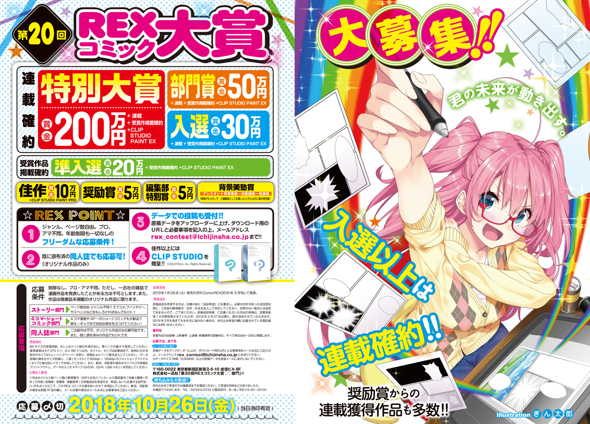 月刊ComicREXでは、アニメ化を果たした『ろんぐらいだぁす!』、『バーナード嬢 曰く。』『政宗くんのリベンジ』『おくさまが生徒会長!』をはじめとした強力連載陣によるマンガが目白押し!特別大賞200万円のマンガ新人賞、REXコミック大賞も大募集中!
