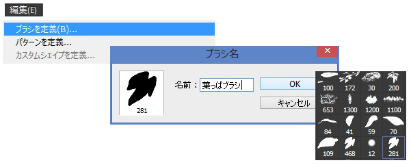 ブラシにしたい範囲を選択し、「編集 > ブラシを定義」でブラシの名前を設定します。