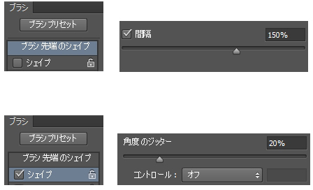- 「シェイプ」項目内の「角度のジッター」を20%