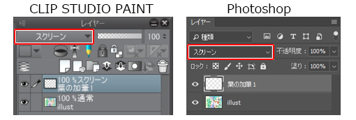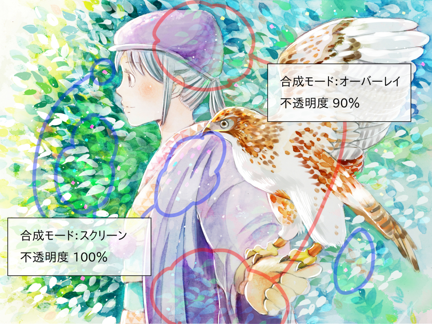[スクリーン]に設定し塗り重ねることで、葉と葉が重なり合い、木漏れ日が漏れているような演出を目指しました。
