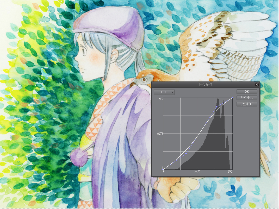 [レイヤー]メニュー→[新規色調補正レイヤー] →[トーンカーブ]を開き、画面が明るくなるよう図のように調整します。