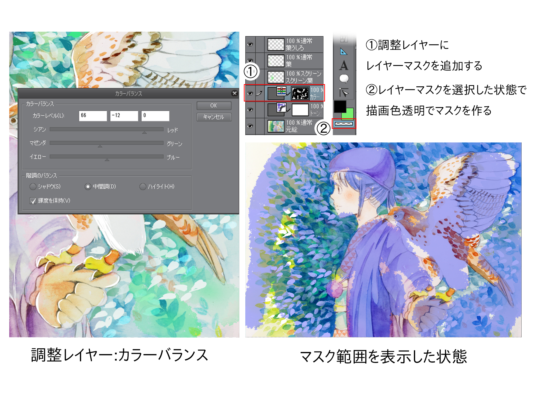 [レイヤー]メニュー→[新規色調補正レイヤー] →[カラーバランス]で図のように調整し、赤味が強い部分は調整レイヤーにレイヤーマスクをかけます。