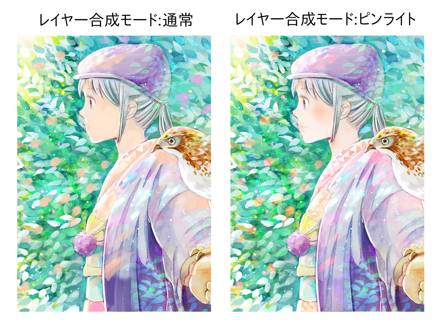 合成モード(描画モード)[ピンライト]レイヤーを作成し、葉や人物に光を当てました。