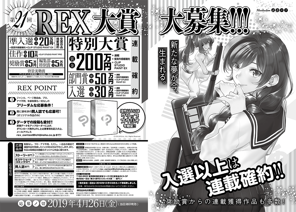 月刊ComicREXでは、『朝焼けは黄金色 THE IDOLM@STER』『アズールレーン Queen’s Orders』『今日、小柴葵に会えたら。』『政宗くんのリベンジ after school』『お稲荷JKたまもちゃん!』をはじめとした強力連載陣によるマンガが目白押し!特別大賞200万円のマンガ新人賞、REXコミック大賞も大募集中!