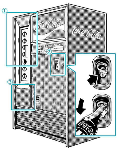 ①ビンの自販機 ②栓抜き ③木目調でシック