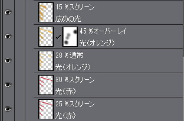 ②このレイヤーを、不透明度や色を変えながら複製して重ねていくと、色味が広がって綺麗な光が表現できます。