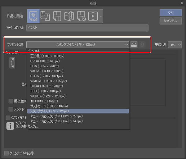 CLIP STUDIO PAINTには最大サイズと同じ370×320のキャンバスサイズが用意されています。