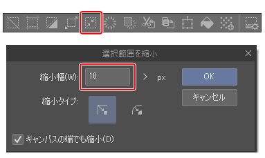 キャンバスをすべて選択してから、[選択範囲ランチャー]>[選択範囲を縮小]を選択して選択範囲を10px縮小します。