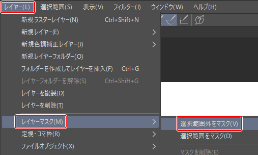 次に[レイヤー]メニュー>[レイヤーマスク]>[選択範囲外をマスク]を選択します。
