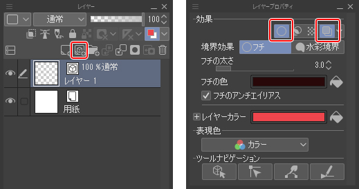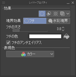 ベクターレイヤーを新規作成して、[レイヤープロパティ]パレットの[境界効果]の[フチ]と[レイヤーカラー]をONにします。