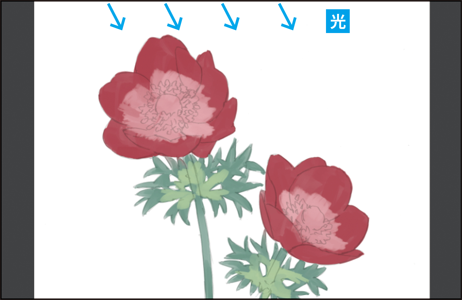 影や光の入れ方が難しい場合は、実際の花の写真を見ながら描くとよいでしょう。