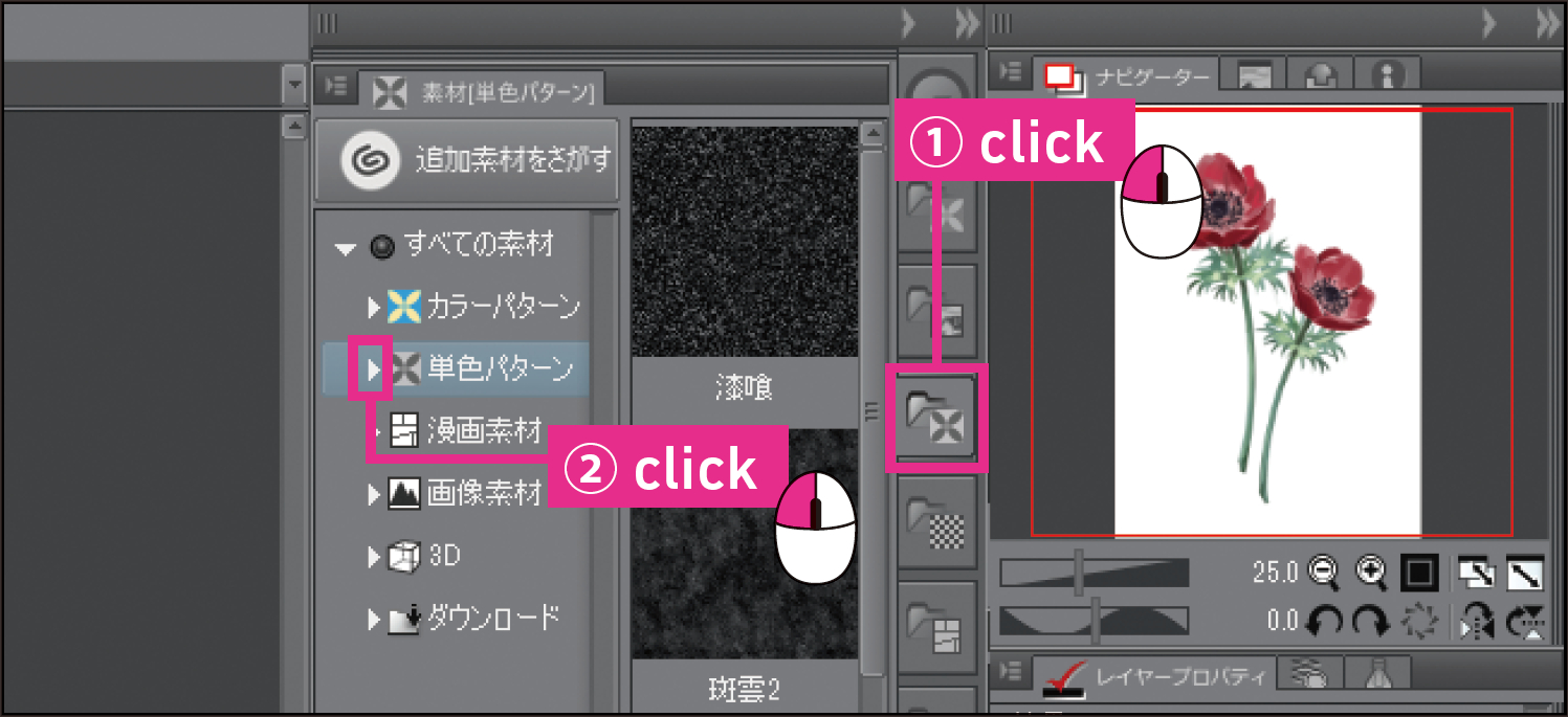 パレットドックから[素材(単色パターン)]パレットを表示し、