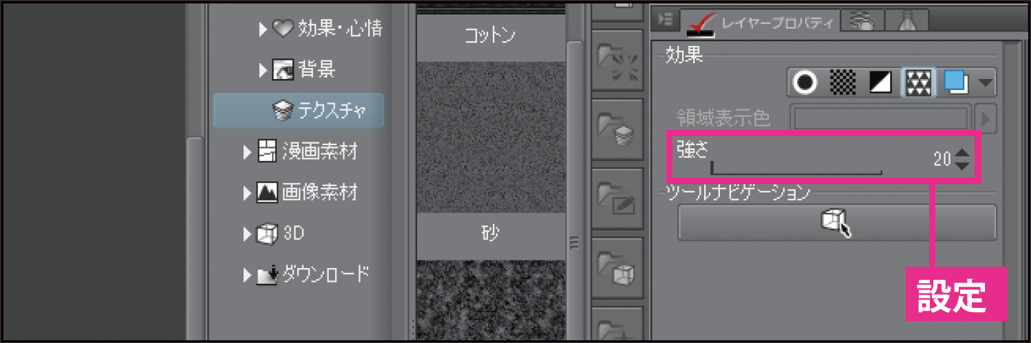 [レイヤープロパティ]パレットの[質感合成]の強さを調整します。