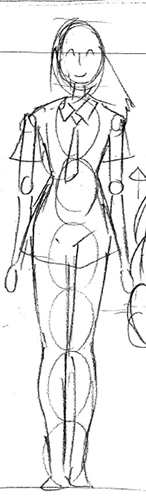首、肩と描き入れたら、大体肩から頭身3つ分下の位置に股が入ります。