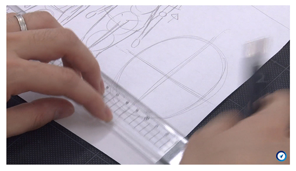 面長に丸を描いて、中心に垂直の縦線、水平の横線を描きます。