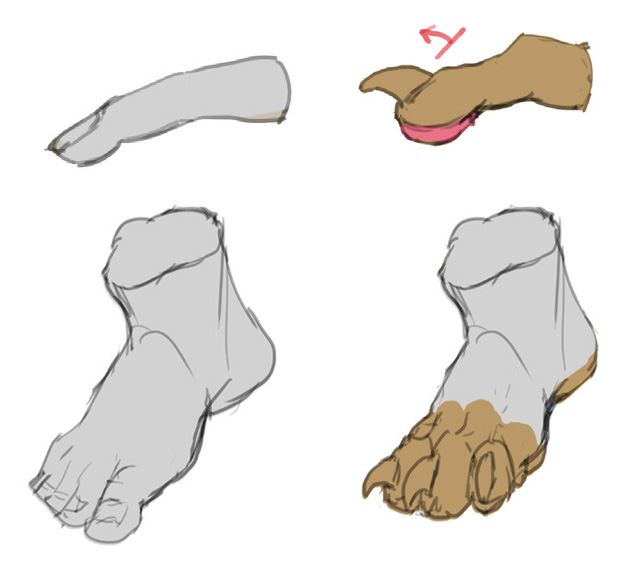 爪を使って狩りをする肉食獣のため、手をついたときには爪が地面につかないようにします。足の爪も同様に考えます(ただし、犬やチーターなどがベースで、爪を走るためのスパイク爪に見せたい場合は地面につけるようにする)。