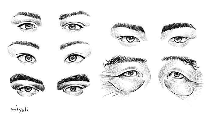 様々な目尻、目の形、眉、まつ毛や瞳を試してみたり、目と眉は別々ではなく、セットとして見るようにします。