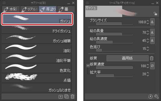 [筆]ツール→[厚塗り]に収録されている[ガッシュ]を使って塗ります。
