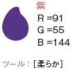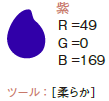 暗い部分を作るように塗ります。上に[オーバーレイ]モードのレイヤーを作成し[エアブラシ]ツール→[柔らか]で紫を重ねます。