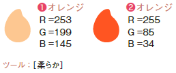 ③[オーバーレイ]モードのレイヤーを作成し、[柔らか]でオレンジ色を加え、完成です。