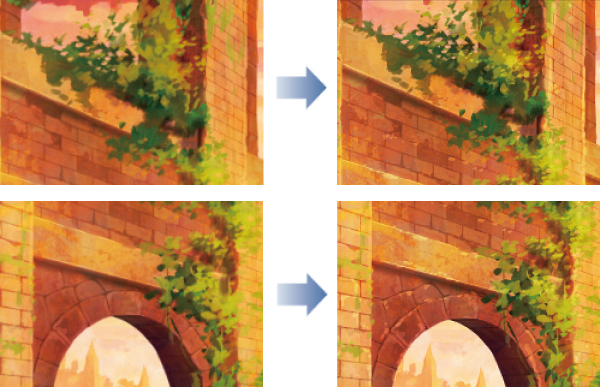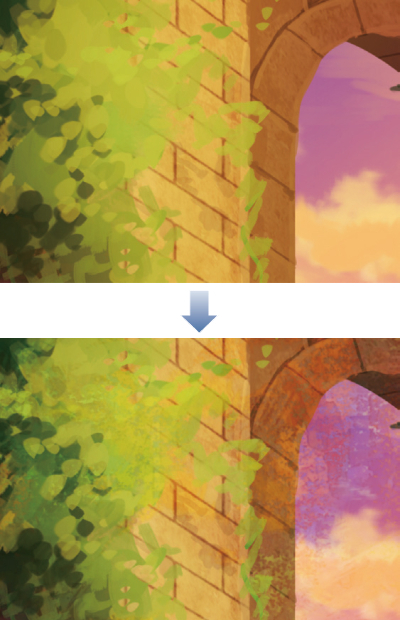 ハイライトを入れます。[オーバーレイ]モードのレイヤーを作成し、明るい黄色で建物の角や葉に点を打つように描きこみます。