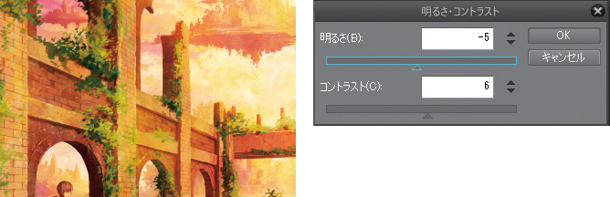 ②[レイヤー]→[新規色調補正レイヤー]→[明るさ・コントラスト]を選び、[明るさ]を−5、[コントラスト]を6上げます。