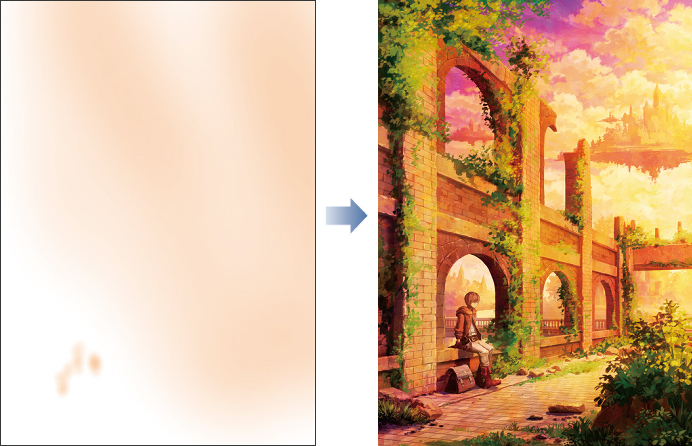 次の図のように、廃墟のイラストを仕上げていくテクニックを紹介します。