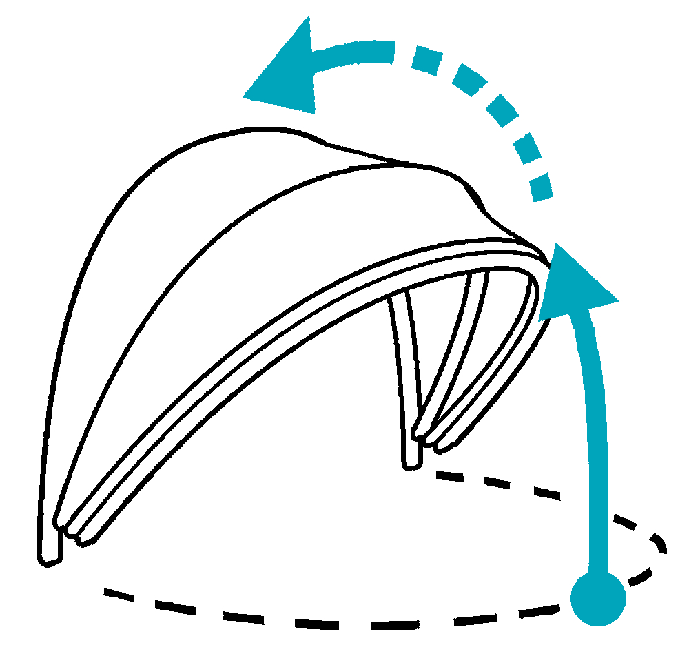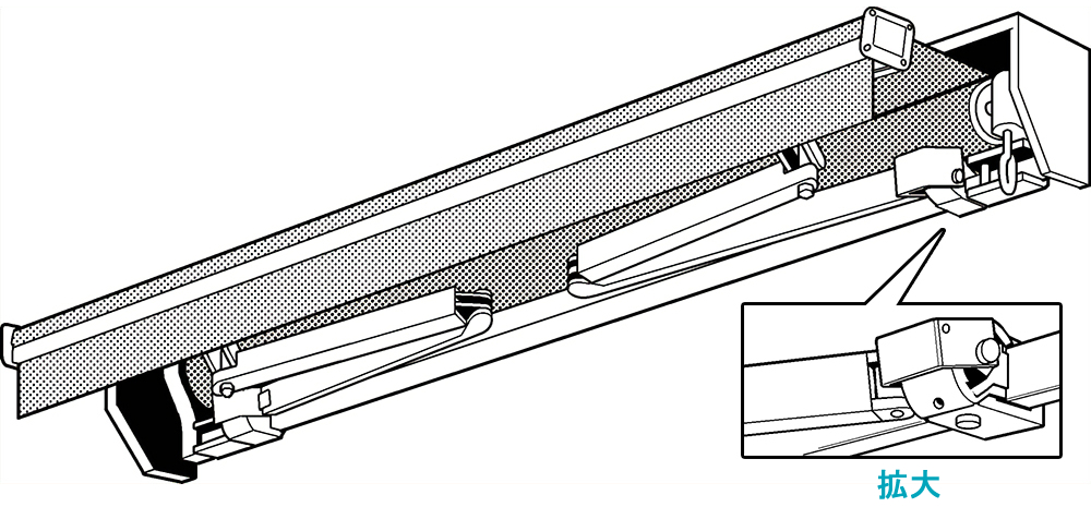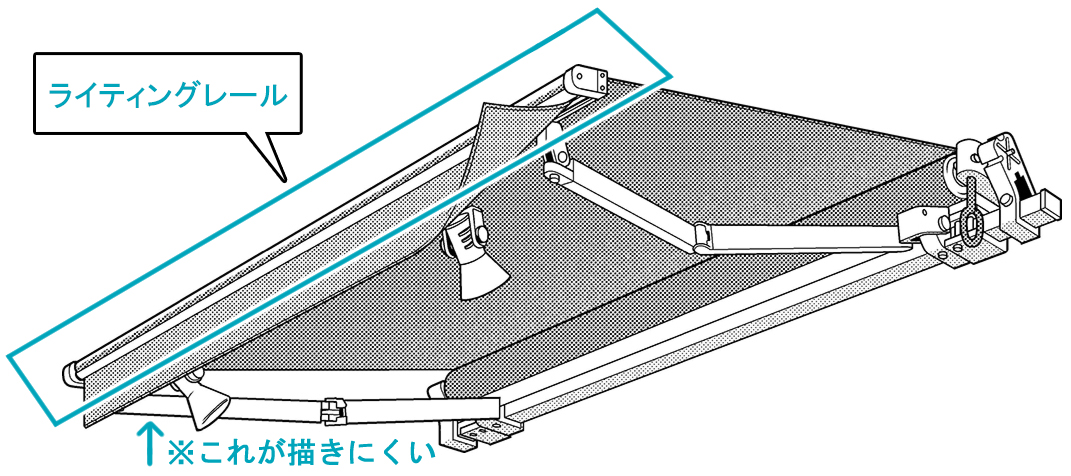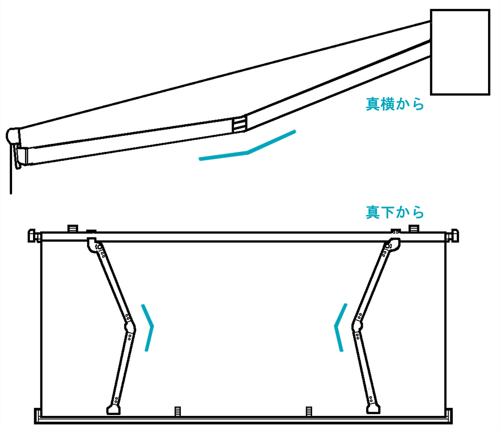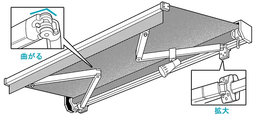 伸びきったときに真逆から見ると下向きにくの字になり、真下から見ても内側にくの字になります。ななめ下の角度から見ているとき、奥のほうの支柱は曲がっているように見えるからやっかい
