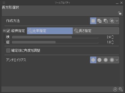 [長方形選択]サブツールで選択範囲を作成し、オプションで、[縦横指定]にチェックをして、[比率指定](左側のアイコン)を選択します。横は2.4、縦はデフォルトのままにします。