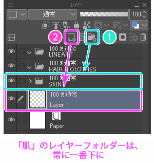 線画の上からではなく、下から着彩したいので、「SKIN」フォルダーは必ず一番下に置いてください。