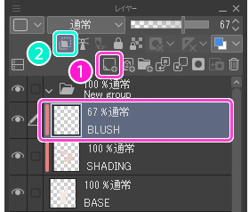 前のレイヤー「SHADING」の上に新しいレイヤー「BLUSH」を作成します。