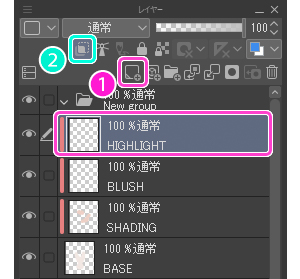 前のレイヤー「BLUSH」の上に新しいレイヤー「HIGHLIGHT」を作成します。
