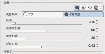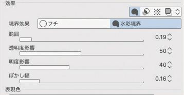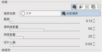 ③ 先程と同様の手順で[水彩境界]でフチをつけておきます。設定は下図のようにしました。