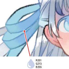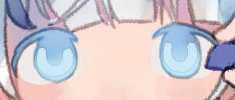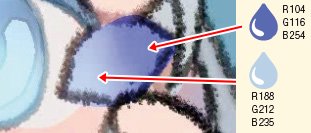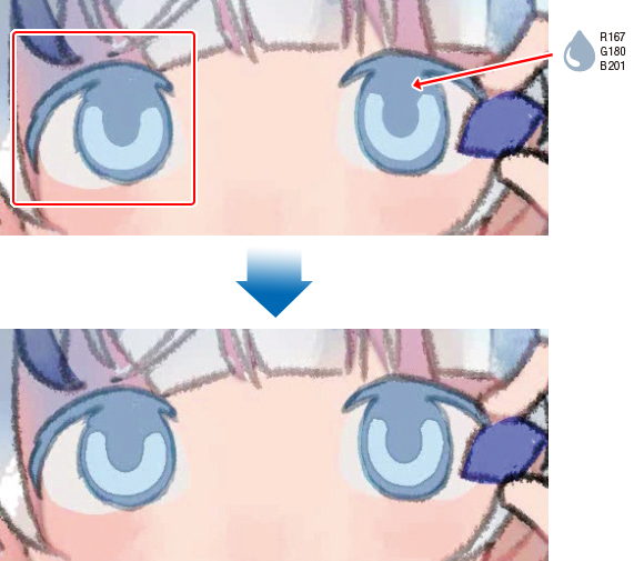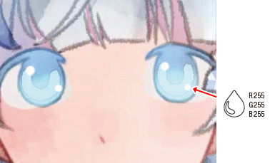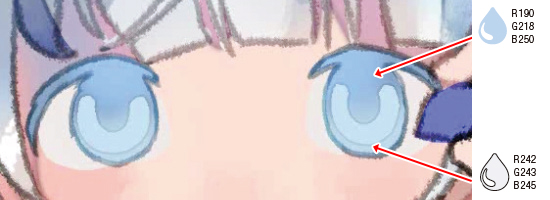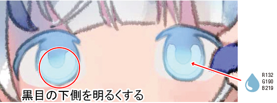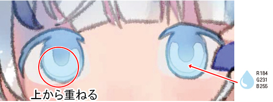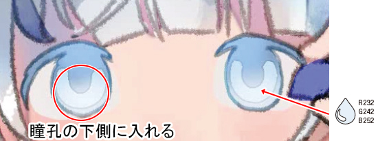 2.で塗った瞳孔の下側に白に近い色を入れて色味を調整します。瞳孔の上側は、青みの強い色で調整しました。