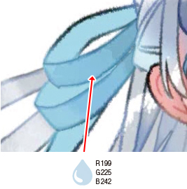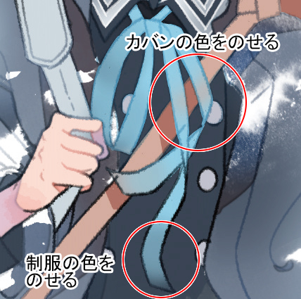 胸のリボンは少し透けて見えるように、レイヤー「リボン」の[透明ピクセルをロック]をオンにして、[SKスプレー]で制服の色やカバンの色を[スポイト]で拾いながら色をなじませます。