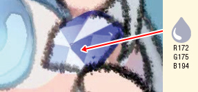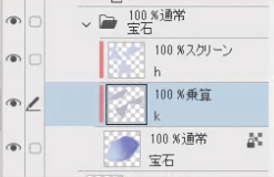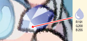 ①レイヤー「宝石」の上から[SKスプレー]で色を重ねます。下塗りの色を[スポイト]で拾いながら形を整えます。