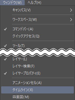 ②[ウィンドウ]メニュー→[タイムライン]を選択し、[タイムライン]パレットを表示させます。