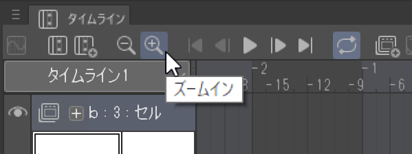 [タイムライン]パレットのフレームが狭くて見づらい場合は、[タイムライン]パレット上の[ズームイン]ボタンを押すとフレームの幅が広がります。