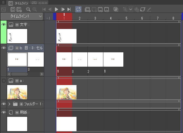 [タイムライン]パレットの、アニメーションフォルダー「b」のフレームに「1」と「3」を「セル指定」します。
