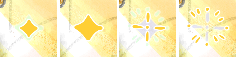 今回は、4枚で一連の動きが完結するように作成し、1→2で大きくなり、3→4で弾けるデザインにしました。小さな花火のようにも見えます。