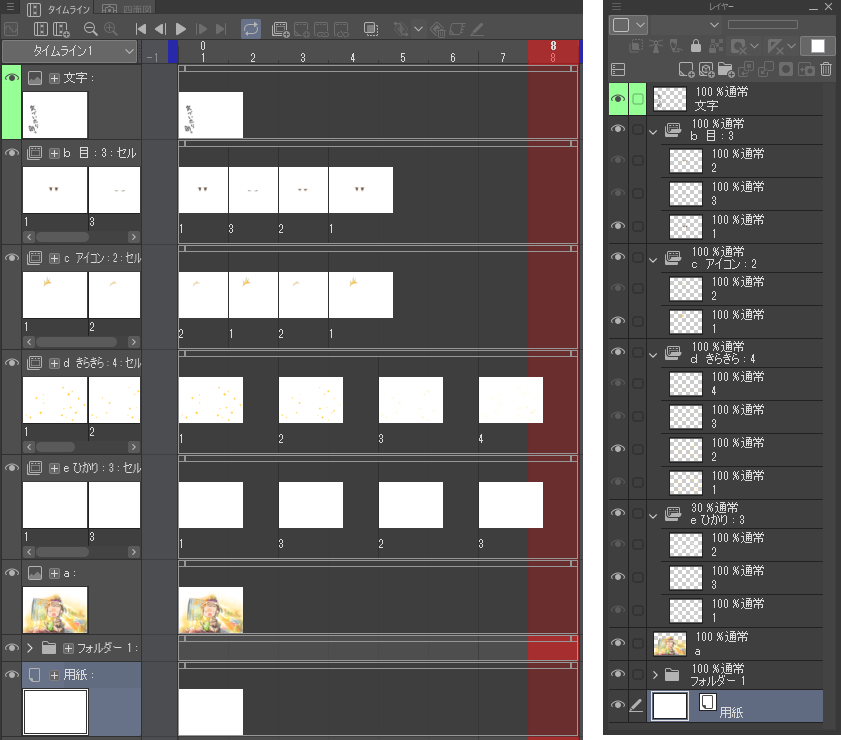 最後に、[新規アニメーションフォルダ]「e ひかり」に太陽光が動く様子を3枚追加して、非表示にしていた文字レイヤーを表示しました。