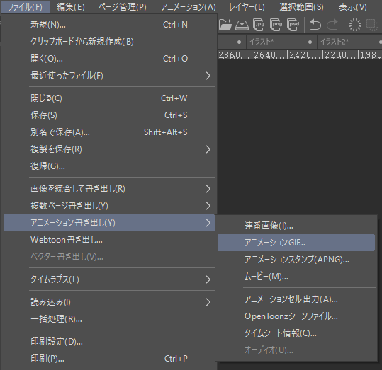 [ファイル]メニューから、[アニメーション書き出し]→[アニメーションGIF]を選択します。