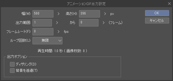 今回は短いアニメーションなので、[フレームレート]、[再生時間]を「8」に設定します。