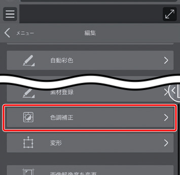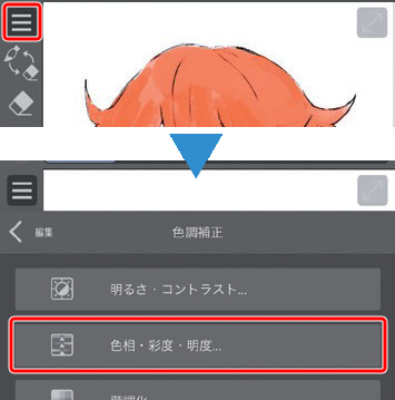 メニューアイコンをタップして、[ 編集]→[色調補正]→[色相・彩度・明度]をタップします。