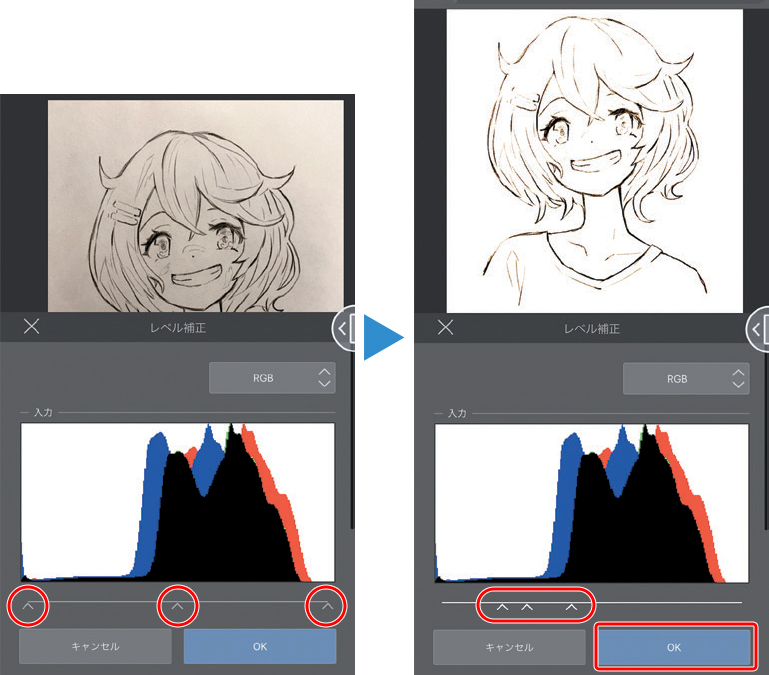 スライダーを動かして紙の部分は真っ白に、線画部分は黒く、線画がくっきり、はっきりと見えるようにしましょう。