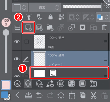 「用紙」レイヤー①をタップした後にレイヤー作成アイコン②をタップしてください。