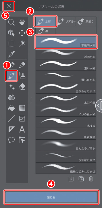 [筆]ツール①をタップして、[水彩]グループ②の[不透明水彩]③を選びます。