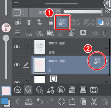 次に[透明ピクセルをロック]①をタップします。「肌」レイヤーの右にアイコン②が出たらOKです。