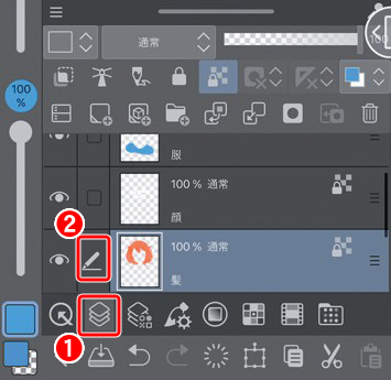 ①をタップしてレイヤー一覧を開き、「髪」レイヤーをタップします。