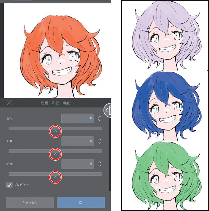 スライダーは上から「色相」「彩度」「明度」をそれぞれコントロールしています。